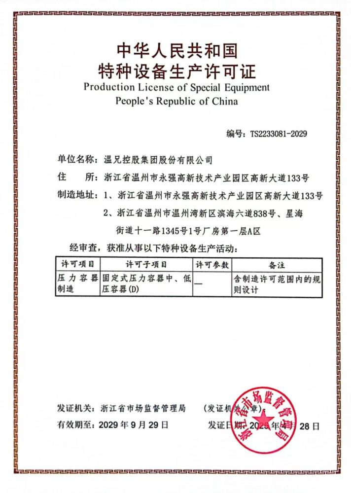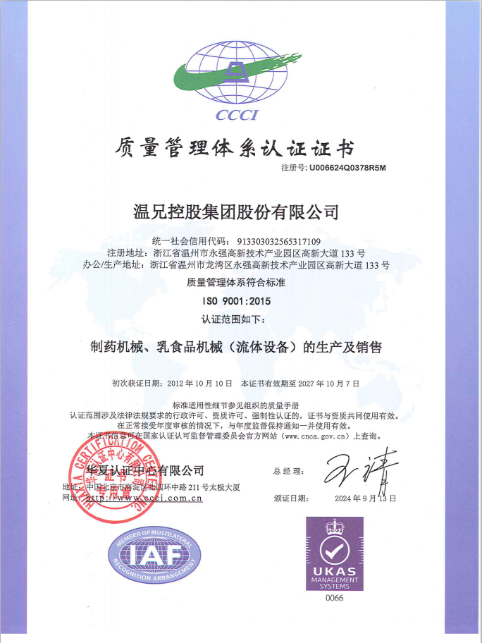 公司始創于2002年,注冊資本10069萬元,是集設計、制造、安裝制藥機械、乳食品機械、化工機械、新能源裝備、衛生級泵閥流體設備于一身的智能制造服務集成供應商。是國家高新技術企業、中國制藥裝備行業協會理事單位、國家中藥現代化科技產業(浙江)基地示范企業、浙江省專精特新企業、浙江省隱形冠軍企業,溫州市智能制造裝備示范企業。并擁有國家特種設備生產許可證【壓力容器制造-固定式壓力容器中、低壓容器(D)】、GC2類壓力容器管道安裝許可證;建筑機電安裝工程專業承包叁級資質。通過ISO 9001質量管理體系、ISO 45001職業健康安全管理體系、ISO 14001環境管理體系認證。